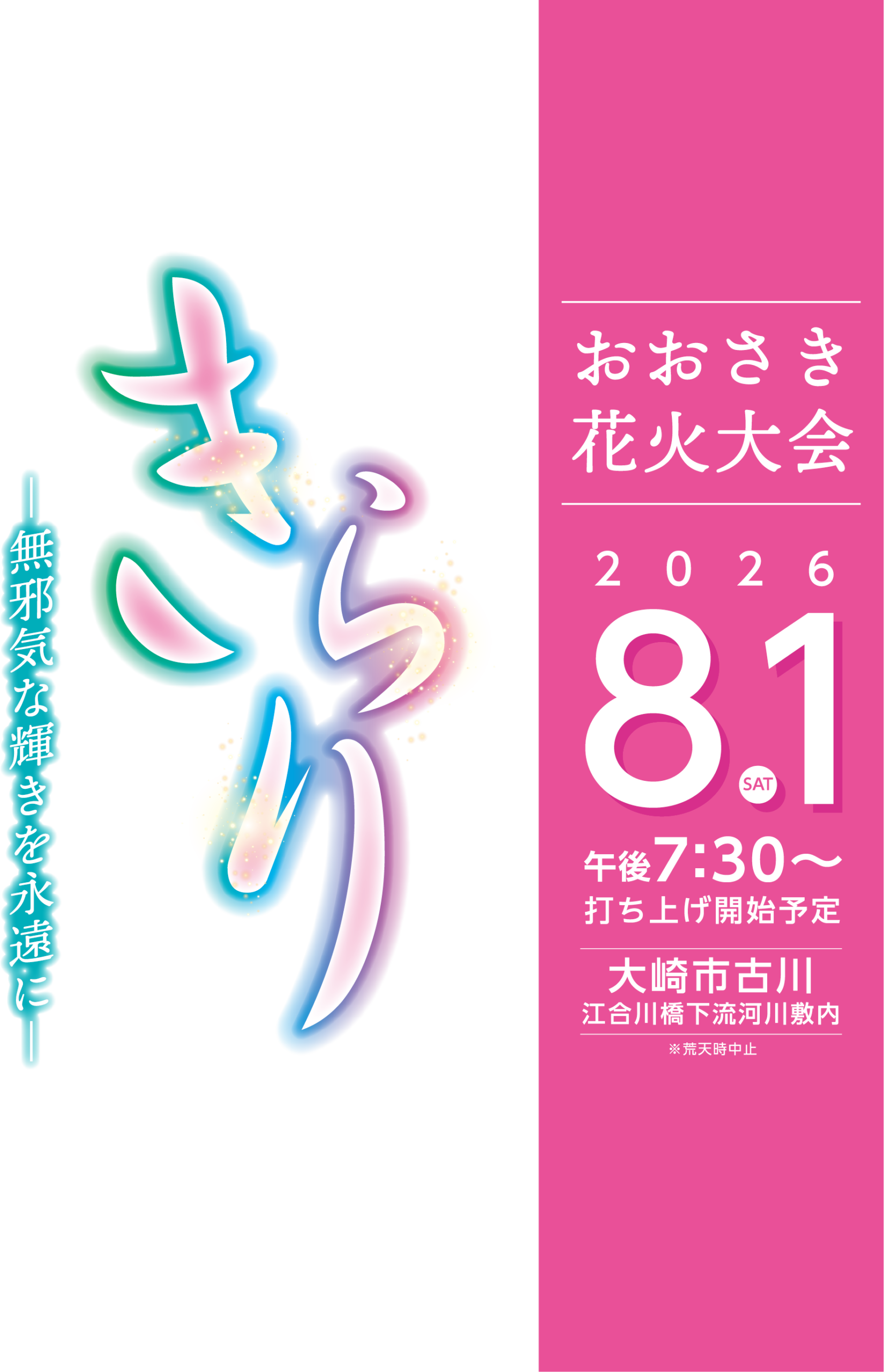 本年度も、おおさき青年会議所は、従来以上に安全対策を徹底し、地域の活性化を図り、子どもたちをはじめとする住民の皆様に喜びと笑顔を届けるべく、夏の夜空に大輪の花を咲かせる所存です。